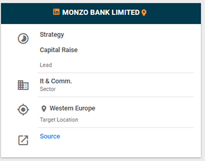 Conway Analytics delivered a Lead Signal highlighting that London-based startup Monzo Bank was raising additional capital for expansion in Europe, the U.S. and Asia for its digital financial services products.