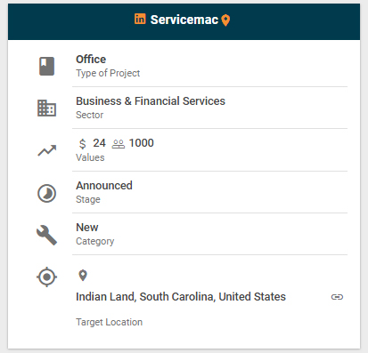 ServiceMac has announced that it will open a new 100,000-sq.-ft. mortgage service operation in Indian Land, South Carolina. The new $24-million investment will create 1,000 jobs over five years. Headquartered in Charlotte, North Carolina, ServiceMac provides back office solutions for the mortgage and real estate sectors.