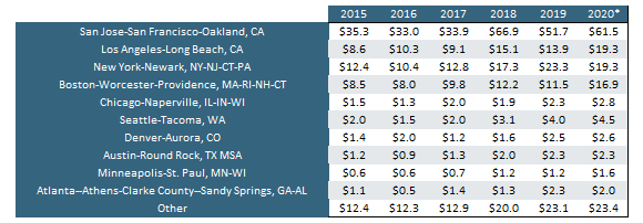 | Top 10 Combined Statistical Areas by Total VC Invested in 2020 Graphs courtesy of NVCA