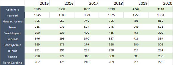 The NVCA offers a complete download of their data sets as well as a complete report, which among other findings says 2020 was the first year ever that total VC has surpassed $150 billion. Compare these charts to recent Site Selection rankings of states and metros. And watch for our own latest assessments of 2020 project activity in the March 2021 “Governor’s Cups” issue of Site Selection.