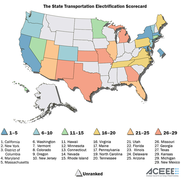 TVA and the Tennessee Department of Environment and Conservation announced yesterday an agreement to collaborate and fund a network of fast charging stations every 50 miles along Tennessee’s interstates and major highways. That sort of initiative may help Tennessee rise from its already promising No. 20 ranking in the new State Transportation Electrification Scorecard, published this week by the American Council for an Energy-Efficient Economy (ACEEE).