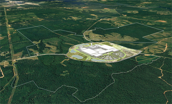 The conceptual semiconductor site plan shown has already been permitted by the US Army Corps of Engineers and depicts 2 million square feet of manufacturing space and 3,500 parking spaces.