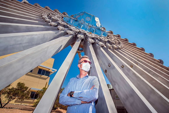 Sandia National Laboratories physicist Aidan Thompson, who champions machine-learning to improve fusion reactors, stands under the shelter of the Sandia “found art” piece titled Starburst. “From 1980 to 1986, the structure was the power flow lines and target chamber of the Particle Beam Fusion Accelerator, Sandia’s earliest major fusion attempt,” Sandia states. An October 2020 release explains how machine-learning techniques, best known for teaching self-driving cars to stop at red lights, may soon help researchers around the world improve their control over nuclear fusion.