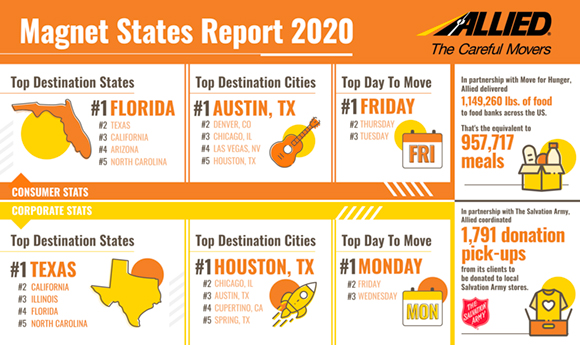Immediately after sharing results from United Van Lines’ 44th annual national migration study earlier this week, we became aware of a similar study, the 2020 Magnet States Report, released by its rival Allied Van Lines. Among its findings: For the second year in a row, Houston was the top destination city for corporate moves and Austin was the top destination city for moves by citizens. The top five destination states for Allied corporate moves in 2020 were Texas, California, Illinois, Florida and North Carolina. “It’s no surprise that Texas, with its business-friendly climate, continues to rank as the top move destination for Allied Corporate Relocation Services customers,” said the mover. For consumer moves, the top destination state was Florida, followed by Texas, California, Arizona and North Carolina. Florida, Arizona and North Carolina were the only three states from the Allied Top 5s to also rank in United’s Top 10, which evaluated states by a different yardstick: the percentage of overall moves that were inbound.