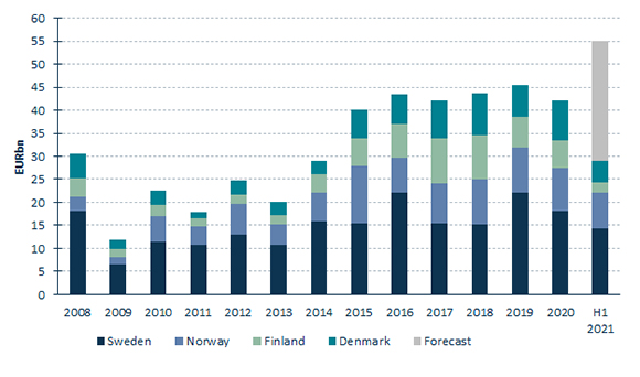 Pangea Property Partners last week reported that the Nordic property markets set a new transaction record of €29 billion in the first half of 2021, appearing to signal a potential new annual record this year that would surpass the record set in 2019 (the only time volume has ever surged above €45 billion).
