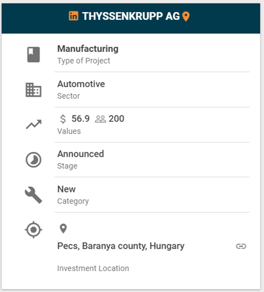 Thyssenkrupp, a German industrial engineering and steel production multinational conglomerate, has recently announced that it will invest $57 million in a new auto components plan near Pécs, Hungary. The new plant is set to open by the end of 2020 and create over 200 jobs. The southwest Hungary location is intended to expand the company’s production and network outside of Germany. The new plant will be used to make valve train parts and electric motor components.
