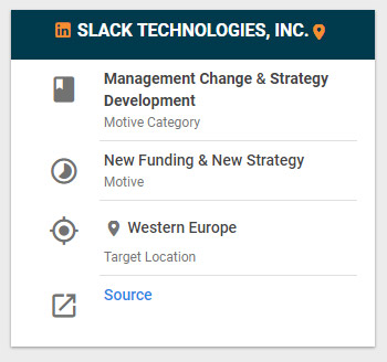 | Lead Signal: Conway delivered a series of Lead Signals in June 2015 indicating that San Francisco–based Slack Technologies had just received $300 million in funding and would leverage the round to open operations in Europe and Australasia.