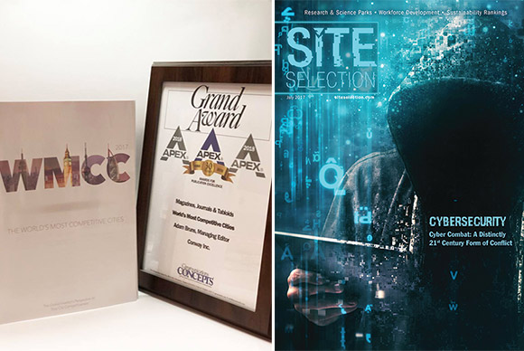 | This week, Communications  Concepts’ APEX  Awards, celebrating their 30th year, gave Conway, Inc., a reason to celebrate  too, as they presented the 2017 World’s Most Competitive  Cities report with an APEX Grand Award, an elite designation  bestowed on 100 outstanding works out of more than 1,400 entries. The award  came in the same week Site Selection’s July 2017 issue received an APEX Award in the Magazines, Journals & Tabloids category for  the quality of writing. The 2018 edition of World’s Most Competitive Cities is coming soon. |  |