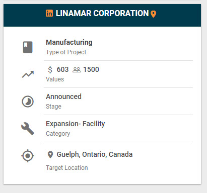 Canadian automotive parts  firm Linamar Corporation has announced the expansion of its  Powertrain/Driveline facility in Guelph, Ontario. The $603-million investment  will create 1,500 jobs and maintain another 8,000 jobs. Linamar manufactures a  variety of products that power vehicles. Operations include machining &  assembly, light metal casting, and forging and assembly. Site Selection first  documented the company’s family roots in Guelph in this 2006  profile.