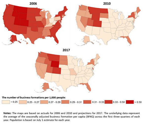 Yesterday, the U.S. Census Bureau announced the release of a new data product that promises to be an ideal complement to Conway Analytics. The Bureau’s Business Formation Statistics (BFS) tracks trends in business applications and formations at the state, regional and national levels, relying on data from business applications for employer ID numbers from the IRS. It also includes projections for business formations in the near future: Figures from the second quarter report released yesterday project that the Midwest will lead in business formations over the next year or two, with the South a close second.