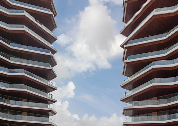 This unusual perspective comes courtesy of Mumbai, India–based Sanjay Puri Architects, designers of a newly completed six-building, 126-apartment complex called Excellenseaa 126 in Surat, Gujarat. The uniquely designed complex — which the architects call a sustainable micro-environment — features extensive landscaping (with vehicles restricted to the perimeter), large cantilevered decks and extensive overhangs to mitigate heat gain in a location where the average temperature is in excess of 35°C (95°F) for eight months of the year. Among projects tracked in Surat in recent years by Conway Analytics are investments by De Beers, CTX Life Sciences, Kiran Gems, Sarin Technologies and Shreyans Textiles.