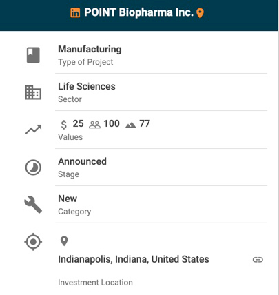 Ontario, Canada–based cancer treatment therapy firm POINT Biopharma announced in May it would establish its first U.S. manufacturing facility in Indianapolis, in a food-grade building it will transform into a Good Manufacturing Practices (GMP) facility that will allow POINT to expand its drug manufacturing operations, with plans to annually produce and distribute more than 400,000 doses. The company expects to move into its new space this year and to be fully operational by 2021. “We are pleased to establish our next-generation, high-tech manufacturing base in Indiana, a state with a robust talent pool, a rich life science ecosystem, and an excellent business-friendly environment,” said Dr. Joe McCann, CEO of POINT Biopharma. “By locating in the Crossroads of America, POINT will deliver our products to patients from coast to coast within hours of production, making a meaningful difference in patients’ lives.”