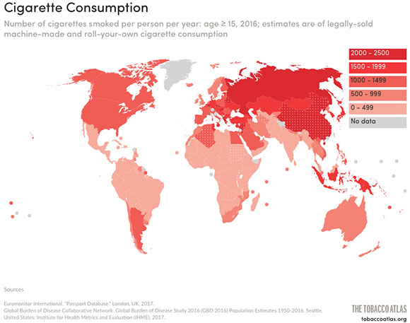Though the use of all manner of tobacco and nicotine products has declined, The Tobacco Atlas reports that about 5,700,000,000,000 cigarettes were smoked worldwide in 2016. Rates have declined in such nations as the UK, Australia, Brazil and even China, but half of Chinese adult males continue to smoke cigarettes and the People’s Republic consumes 40% of all cigarettes globally. As for the future, “many of the tobacco industry’s largest markets are highly populous countries across Asia, and the fastest growth is largely in Africa and the Eastern Mediterranean,” The Tobacco Atlas reports. The number of tobacco smokers is set to increase by 24 million in Indonesia and by 7 million in Nigeria from 2015 to 2025. — Adam Bruns