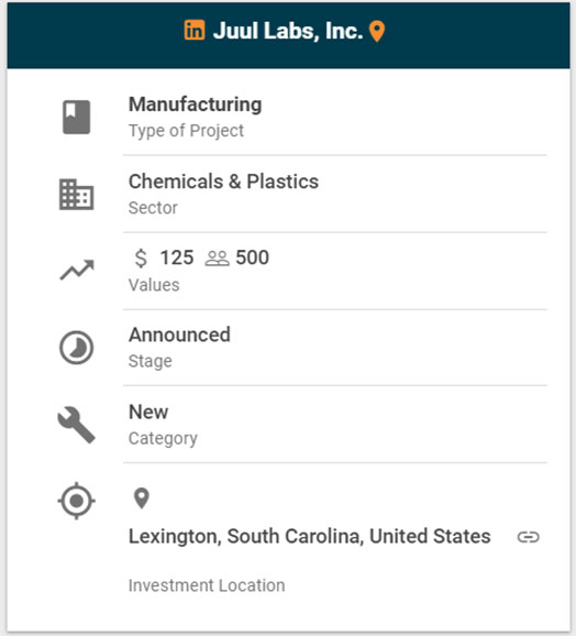 Juul Labs, Inc., the electronic cigarette company, announced plans to invest over $125 million in a new assembly facility in Lexington, South Carolina, just southwest of the state capital Columbia. The new facility will be used to assemble Juul products using advanced production techniques and will bring over 500 jobs to the area. Production in the new facility is set to begin in the summer of 2019. Juul Labs forecasts 2019 revenue will be tripled from 2018.