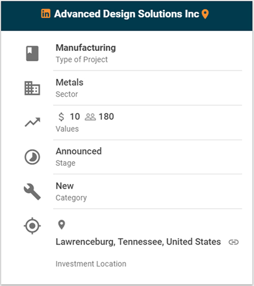 Canadian auto supplier Advanced Design Solutions Inc. will invest $10 million and create up to 180 jobs in Lawrence County, Tennessee, south of Nashville and west of I-65 along the Alabama state line. Proximity to original equipment manufacturers (OEMs) makes Lawrence County an optimal location for the company, which will manufacture steel shipping racks at the new facility. The company expects production to begin this month.