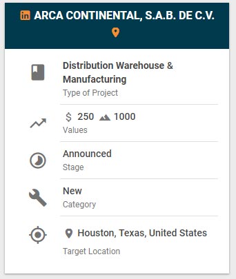 ARCA Continental (based in Monterrey, Mexico) and its U.S. subsidiary Coca-Cola Southwest announced that they will build a new production and distribution facility in Houston, Texas. The $250-million, 1-million-sq.-ft. facility will begin operating in 2020. Arca Continental produces and distributes non-alcoholic beverages under the brand of The Coca-Cola Company as well as salty snacks under the brands of Bokados in Mexico, Inalecsa in Ecuador, and Wise in the United States.