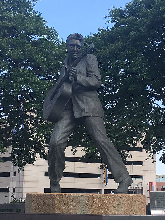 Senior Editor Gary Daughters last month made this photo of the bronze Elvis statue by Andrea Lugar that was installed in 1997 on Beale Street in Memphis, Tennessee. It’s the second bronze Elvis to occupy the spot, as the first one, installed by Eric Parks in 1980 (three years after the King’s death), “proved too delicate for the elements and souvenir-crazed fans, who stripped its guitar strings and tore the tassels from Elvis’s suit,” reports the endlessly fascinating Roadside America. It was taken down in 1994 and moved to a nearby Memphis welcome center. Lugar’s statue, says the website, is protected by a fence, and shows Elvis “as he would have looked on Beale Street circa 1955 (pre-tassels), wearing a stage outfit he might have bought at Lansky Bros. down the block.”