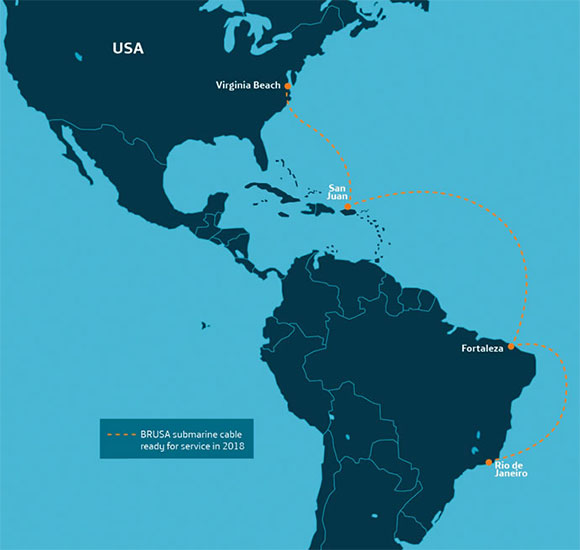 | Telefónica’s BRUSA submarine cable linking Rio de Janeiro and Fortaleza (Brazil) with San Juan (Puerto Rico) and Virginia Beach (USA), spotlighted by Site Selection in April 2016, deployed in August 2018, enabling Telefónica’s Telxius infrastructure operation to establish new capacity and very low latency to Europe and Latin America at the QTS data center in Richmond, Virginia.