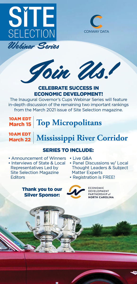 Today marks the debut of the entire Digital Edition of the March 2021 issue of Site Selection. A facsimile of our 224-page print edition, the issue includes the Governor’s Cups, Top Metros and other highly anticipated rankings, among them the Top Micropolitan and Mississippi River Corridor rankings that will be discussed in depth in free webinars on March 15th and March 22nd, respectively. Elsewhere in an issue chock-full of enterprise reporting and exclusive interviews you will find coverage of data centers, airport cities and agribusiness; area spotlights on Connecticut, Georgia, Illinois, Indiana, Maryland, Minnesota, South Carolina and the South-Central states; the Tucson Intelligence Report; and Investment Profiles about Hampton Roads, Hoosier Energy, Indiana Municipal Power Agency, Puerto Rico, Round Rock, San Bernardino County, South Carolina Ports Authority and Southwest Louisiana.