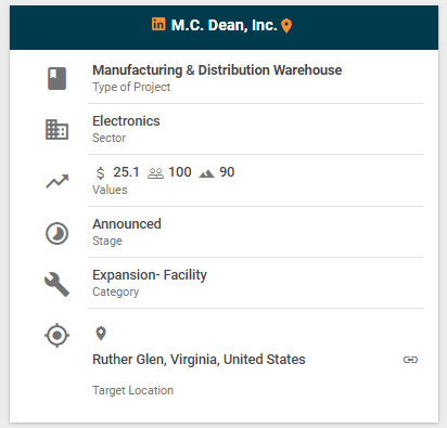 M.C. Dean is investing $25 million to expand its manufacturing capacity in Ruther Glen, Virginia. The expansion will add 90,000 sq. ft. and 100 new jobs. M.C. Dean is an electrical- design-build and systems integration firm based in Tysons, Virginia, that builds and installs electrical, electronic security, telecommunications, instrumentation-and-control and command-and-control systems. The company has more than 3,500 employees in the Eastern U.S., Europe and the Middle East.