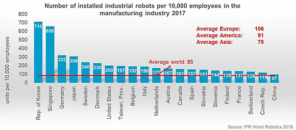 Preliminary results of the World Robotics Report 2019 released today by the Frankfurt, Germany–based International Federation of Robotics (IFR) show installations of industrial robots in the UK fell by 3% to 2,306 units in 2018, after sales had risen by 31% the year before. Mike Wilson, chairman of the British Automation and Robot Association (BARA), appears unfazed. “The consequences of the Brexit vote and subsequent political developments are leading to reduced labor availability as the many workers who have come over from Eastern Europe are starting to return home,” he says in an IFR release. “As a result, businesses have to ensure that they use their workforce effectively and find alternative ways of performing tasks for which they have a shortage of staff — robot automation being an obvious solution.”