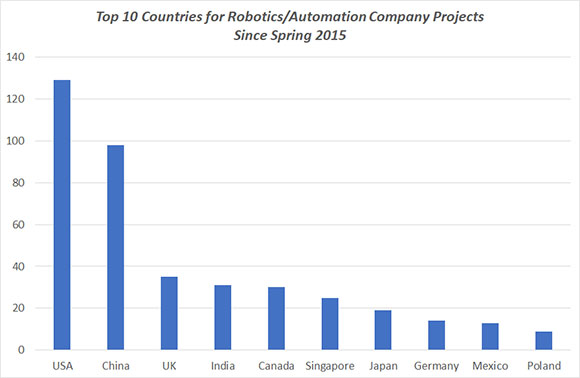 Searching by the keyword “automation” over the past four years yields more than 540 corporate facility projects involving robotics in the Conway Analytics proprietary database, from such firms as ABB (in seven different countries), Festo, Kuka, Schneider Electric and smaller firms. Here are the leading countries: