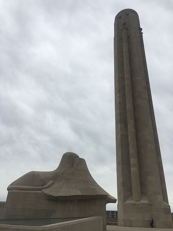 Managing Editor Adam Bruns made this photo early this week at the National WWI Museum and Memorial (aka the Liberty Memorial) in Kansas City, Missouri. Dedicated in 1921, the memorial is inscribed in honor of those who served in “the World War.” Two Assyrian Sphinxes guard the south entrance: “Memory” (shown) faces east toward the battlefields of France, “shielding its eyes from the horrors of war,” says the museum’s website. “Future” faces west, “shielding its eyes from an unknown future.”