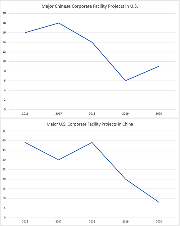The Conway Analytics projects database allows for analysis of greenfield and facility expansion projects by country of origin and target location. The graphs presented here represent facility project tallies in both directions over the past five years. So far this year, two Chinese projects in the U.S. have been tallied, including a 150-job mattress and pillow manufacturing plant in Rock Hill, South Carolina, from MLILY USA, a Knoxville, Tennessee–based company whose parent is Chinese firm Healthcare Co., Ltd. Going in the other direction, U.S. FDI in China is down too, reflecting the influence of the pandemic and U.S.-China trade tensions as cited by Rhodium’s report. But already this year we have tracked eight major projects landing in China, including a $250 million, 280-job frozen food plant from Idaho-based Lamb Weston in Ulanqab Shi, Inner Mongolia Autonomous Region, and a 165-job operation from New York–based Spellman High-Voltage Electronics Corp. in Suzhou. — Adam Bruns |