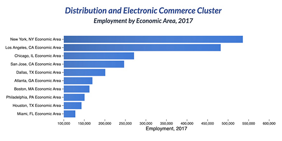 |       | The U.S. Cluster Mapping  Portal founded by competitiveness guru Professor Michael Porter and supported  by Harvard’s Institute for Strategy and  Competitiveness has executed what it calls “a complete data refresh” with  updated cluster profiles and performance benchmarks for all U.S. regions,  encompassing over 50 million open data records. The graph below, for example,  shows which areas led in employment in the distribution and e-commerce cluster  in 2017. Most of these areas have only grown their profiles in the field since  that time — and continue to do so even today. (Read more about the role of  logistics in pandemic times in the July issue of Site Selection.) A search of these 10 metro areas in the  Conway Analytics database turns up nearly 380 corporate facility investments from  the past five years with a distribution or warehouse function. Dallas-Fort  Worth leads the way, followed by Chicago and Los Angeles. |