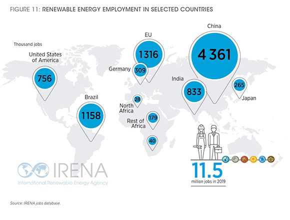 The seventh edition of “Renewable Energy and Jobs – Annual Review” released by the International Renewable Energy Agency (IRENA) this week shows that jobs in the sector reached 11.5 million globally last year, led by solar PV with some 3.8 million jobs, or a third of the total, followed by biofuels with 2.5 million jobs. Last year, 63% of all renewables jobs were recorded in Asia, with China accounting for 38% of the global total, the new report reveals.