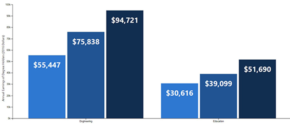 This graph made using the PSEO tool compares earnings one, five and 10 years after graduation for bachelor’s degrees in engineering and in education from the University of Colorado Boulder.