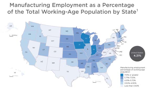 Over the next decade, manufacturers will need to fill 4.6 million jobs, according to the Manufacturing Institute. The U.S. Census Bureau this week reports that the manufacturing sector employed 11.6 million workers in the United States in 2016, with an average annual payroll by employee of $57,266. As the map indicates, Wisconsin, Indiana and Iowa had the highest percentage of manufacturing employment of working-age population. Conway Analytics has recorded more than 1,570 corporate facility projects in those three states over the past four years, with 54% of them devoted to manufacturing.