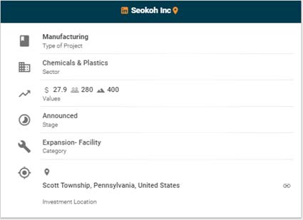 Seokoh, Inc., a cosmetics manufacturer, announced that is will invest $27.9 million in an expansion of its existing factory in Scott Township, Pennsylvania. The project is estimated to add 280 new jobs to the company’s existing 290 employees. The expansion will consist of two buildings, each roughly 200,000 sq.ft. Significant tax incentives, including an extension of Keystone Opportunity Zone benefits, were an enticing factor contributing for the location decision.