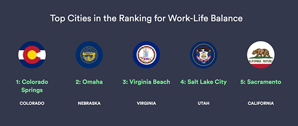 - Colorado Springs, Omaha and Virginia Beach top the ranking as the U.S. cities with the highest work-life balance score.