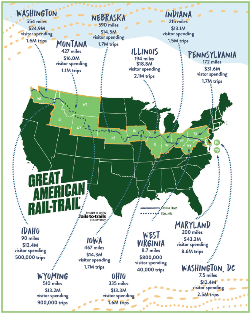 In 2022 the same firm analyzed the economic potential of the Great American Rail-Trail, a 3,700-mile route through 12 states and the District of Columbia that was 53% complete at the time, with around 150 existing trails on the route and 88 gaps still to fill.