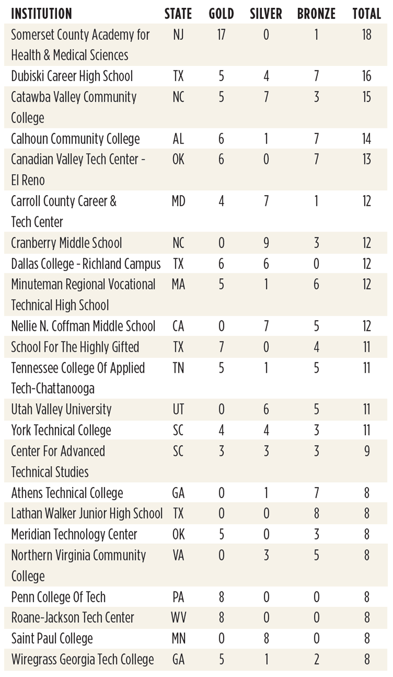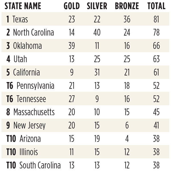 Yes, you read that right: Somerset County Academy for Health & Medical Sciences earned 17 gold medals — a gold medal tally better than all but seven entire states. The accomplishment further burnishes the county’s life sciences reputation. The second-place school, John A. Dubiski Career High School, describes itself as a public school of choice in the Grand Prairie ISD in the Dallas-Fort Worth metro area. There are 14 programs of study from health sciences to automotive to cosmetology, all aligned with U.S. Department of Labor Career Clusters.