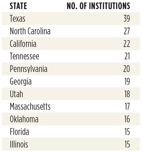By number of institutions earning medals, here are the top 10 states and ties: