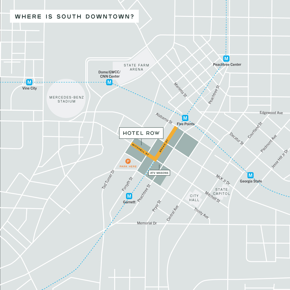 South Downtown Atlanta is anchored around the L created by the intersection of Broad Street and Mitchell Street between MBS Stadium and City Hall.