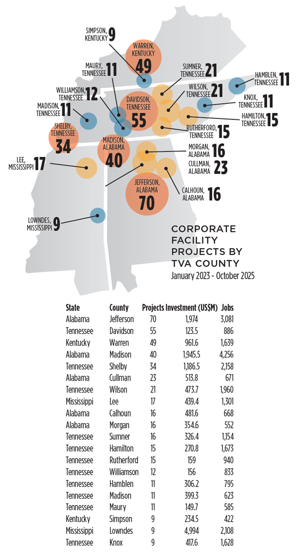 The big news deserves the attention: As documented elsewhere in this issue of Site Selection and in past issues, pioneering projects and plans involving TVA continue to move forward in the nuclear energy field — witness its achievement of the first Gen IV nuclear power purchase agreement and its support for a commercial fusion plant. Across the 80,000 square miles of its service region, including all of Tennessee and portions of Alabama, Georgia, Kentucky, Mississippi, North Carolina and Virginia, TVA helped attract over $6.6 billion in investment and expects to create over 9,000 new jobs as a result of its FY2025 economic development work. That’s after a 2024 that saw the organization and its economic development team attract 10,368 new jobs, with 42,300 retained jobs and $8.9 billion in capital investment.